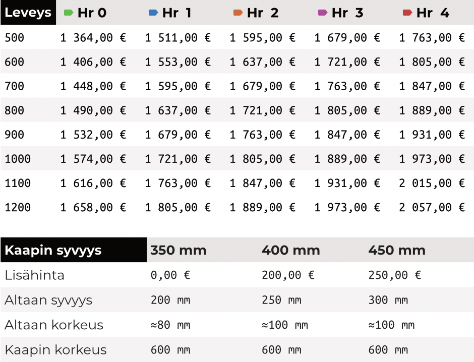 | Altaan syvyys (mm) | 200, 260, 300 |